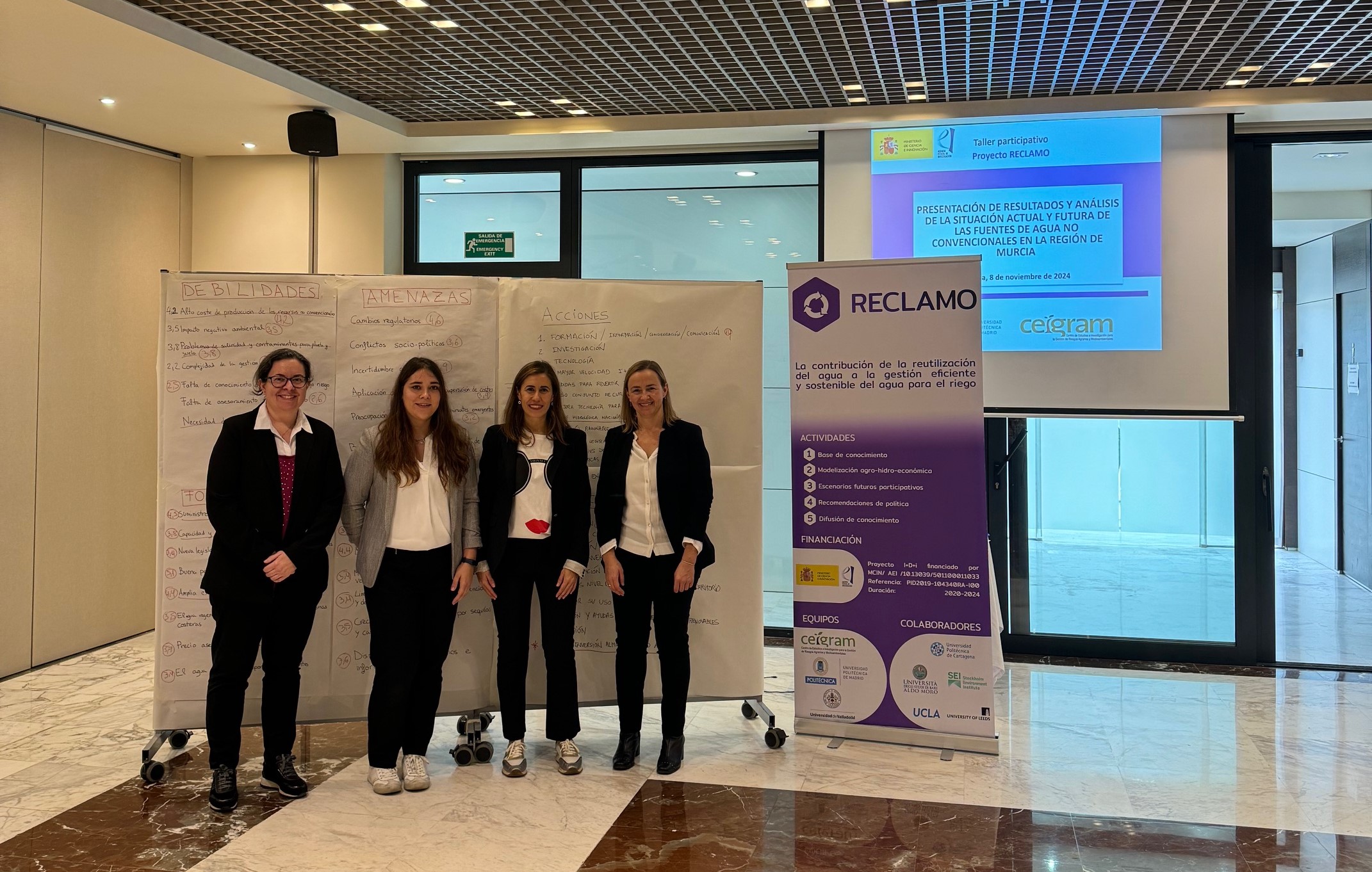 El 8 de noviembre de 2024, en el Hotel Siete Coronas de Murcia, el proyecto RECLAMO organizó un taller participativo para presentar los resultados del proyecto y analizar el presente y futuro de las fuentes de agua no convencionales (desalada y regenerada) en la región de Murcia. Al evento asistieron actores clave del sector agrícola e hídrico en Murcia, incluyendo comunidades de regantes, empresas, organizaciones ecologistas, representantes gubernamentales, así como expertos y técnicos.